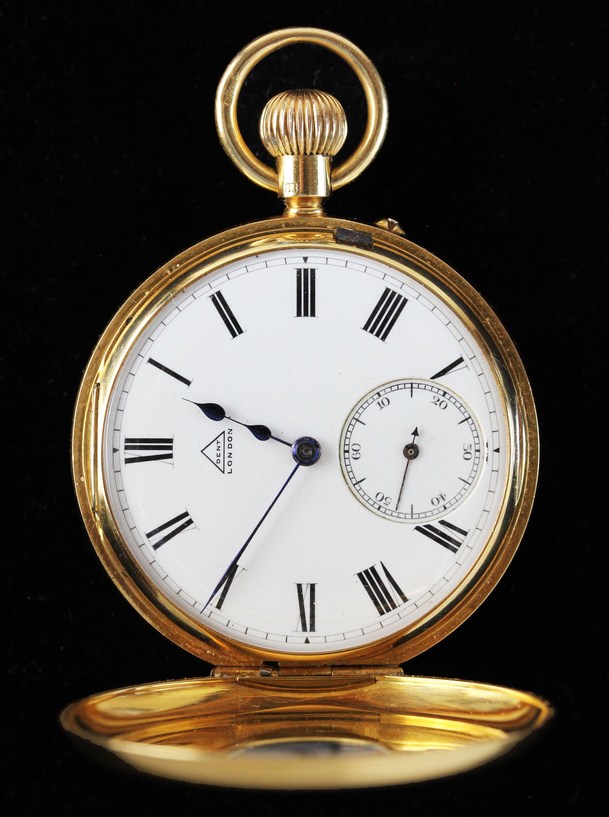 Very solid made English so called "Half Hunter" pocket watch from the London watch company DENT in 18 kt. gold from 1885 in perfect condition.