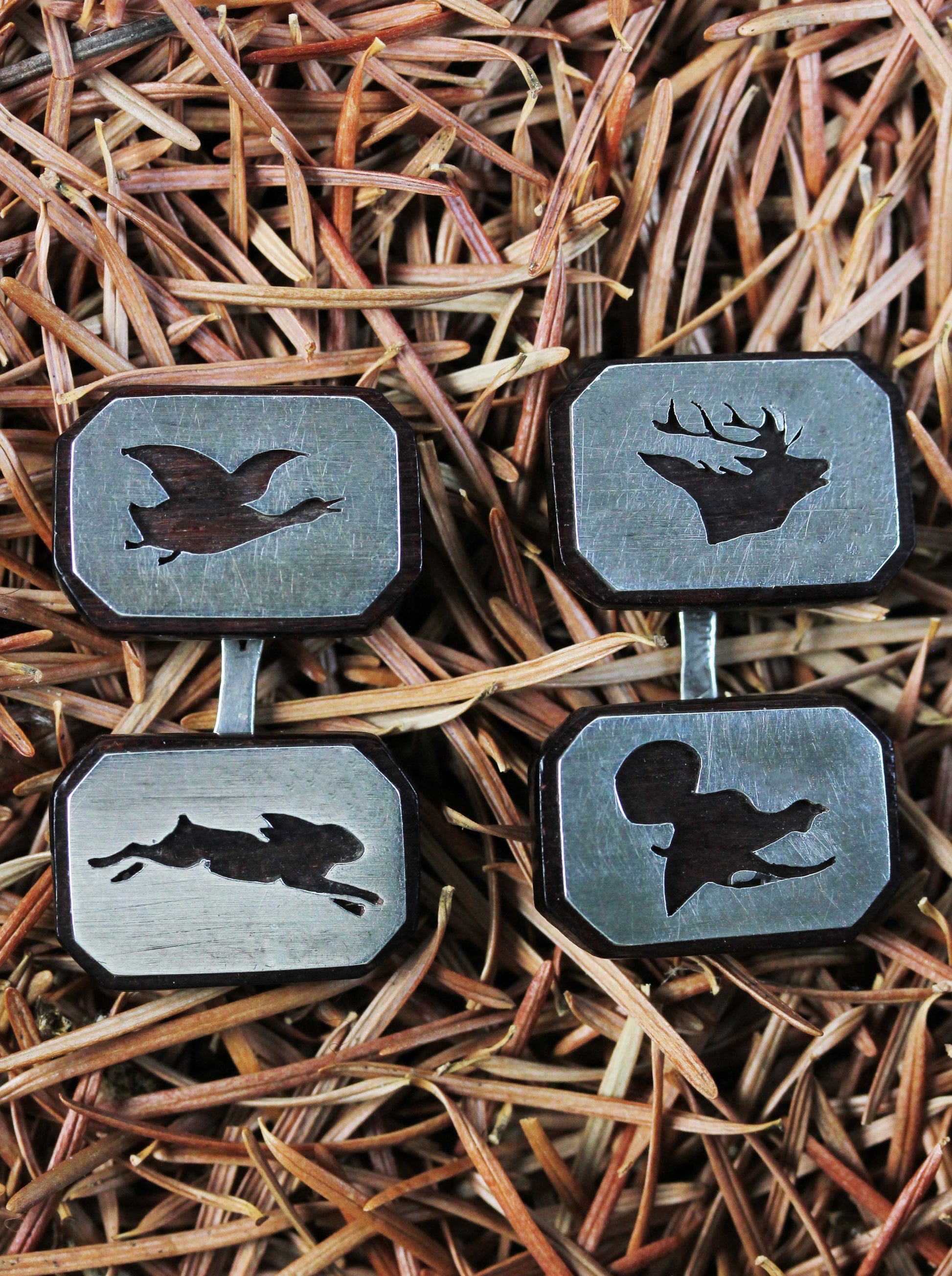 Fine vintage hunting cufflinks with a wild goose, a deer, a hare and a woodcock on rose wood made by the FABERGÉ jeweler Victor Mayer.